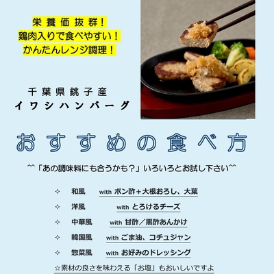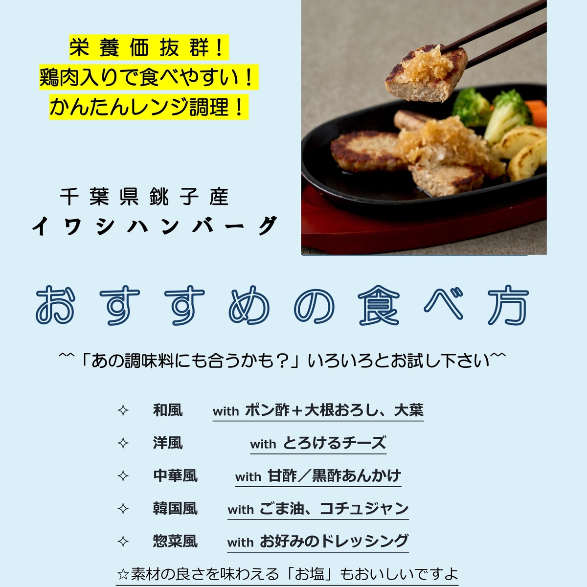 当ストア人気No.1おかずパッケージがリニューアルされて10月21日(火)発売しました!毎日のおかずに、千葉ギフトに、お手土産に。 イワシハンバーグ8P ツイートする シェアする 販売価格: 798円(税込み) 会員価格 758円(税込み) 通常価格 (税込み) 在庫 商品コード JANコード 数量 - + カートに入れる カテゴリー お 手 軽 お か ず キャンペーン 🐠会員さま冷凍品5%OFF🐠| 🌊房総の味 柔らかい食感の当店オリジナルハンバーグ栄養たっぷりの銚子水揚げ真いわしのすり身に、国産鶏肉を合わせました。魚臭さをなくしつつ、いわしの美味しさを引き立てた簡単調理おかずです。お母さんと子どもに◎簡単調理で良質なお魚おかずを・いわしのEPA・DHAは・・・妊娠中や授乳中に(お母さんが食べることで)胎児期~乳児期の発育を促します・柔らかく魚臭さが少ない・・・幼児期のお子さんの魚離れ予防にお試しください・鶏肉には・・・身体の成長を支える良質なたんぱく質(必須アミノ酸)が多く含まれます【美味しい温め方】*必要な分だけ耐熱皿へ移し電子レンジ600W×1分(目安)ふわふわ食感に仕上がります^^*「お弁当」にお使い時や、「レンジが無い」時は、常温解凍でも召し上がれます RELATED ITEMS 関 連 商 品 いわしごま漬 580円(税込み) 忙しくてもきちんとごはんセット 2,850円(税込み) イワシハンバーグ メガパック 2,300円(税込み) 国産さんま 一夜干 320円(税込み) 銚子産あじ一夜干4枚入 1,300円(税込み) 国産かます一夜干(大) 400円(税込み) いわし生姜煮 2尾入 370円(税込み) 個包装・骨取り銀鮭切身(甘塩) 1,080円(税込み) いわし団子 390円(税込み) 牛すじとろ煮 1,080円(税込み) 銚子産いわし明太子 3尾入 850円(税込み) 銚子たかねの定番佃煮セット 1,550円(税込み) ひものセット「潮騒」 3,900円(税込み) ひものセット「君ヶ浜」 2,800円(税込み) ひものセット「犬吠埼」 2,200円(税込み) しらす 700円(税込み) 銚子産めひかり(冷凍・唐揚げ用) 760円(税込み) 国産さばフィーレ(片身) 400円(税込み) 手作り さばもろみ漬 580円(税込み) ひものセット「大漁」 3,750円(税込み) 在庫切or期間限定 銚子つりきんめ 2,450円(税込み) 在庫切or期間限定 あかうお一夜干 (大) (1尾) 680円(税込み) きんき一夜干 600円(税込み) 銚子産あじ一夜干 320円(税込み) ちりめん山椒 540円(税込み)